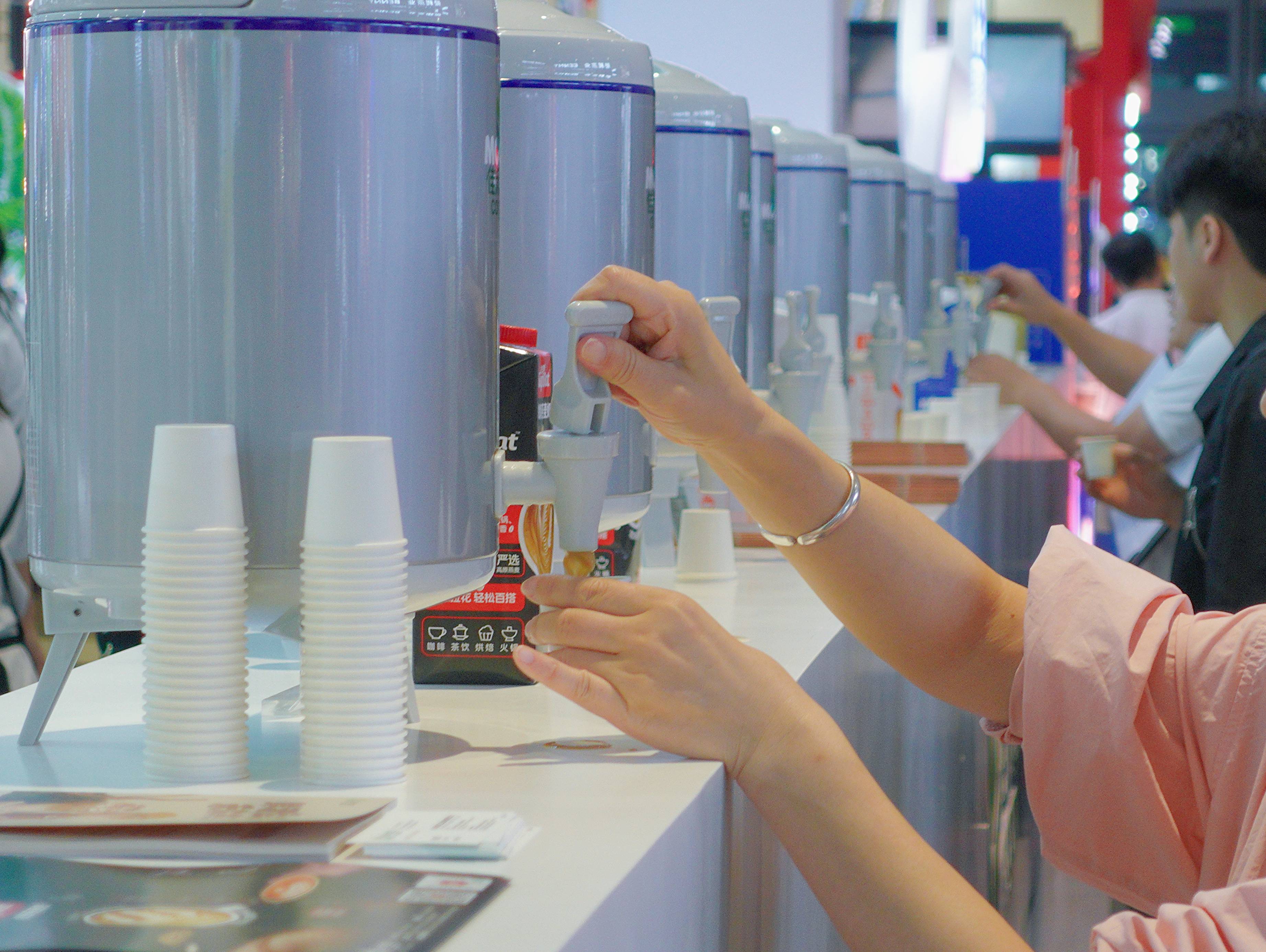 展台现场,来自四面八方的观众积极试饮,有观众感叹“每款都尝一下,直接喝到饱!”