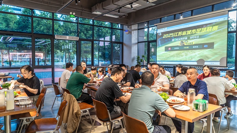 夕阳西下,苏小麦特色主题餐厅内阵阵香气扑鼻而来。员工们化身"美食达人",围坐一团,尽情享受着美酒佳肴。在美食的温柔陪伴下,平日里专注工作的面孔多了几分轻松与笑意。大家边吃边聊,从工作心得到生活趣事,进行着无拘无束的交流。夜幕降临,苏超联赛精彩对决同步上演,现场的欢呼声与碰杯声交织成了这夏夜最美的和弦,让职场人暂时卸下了压力,在烟火气中触摸到彼此最真实、最温暖的一面。